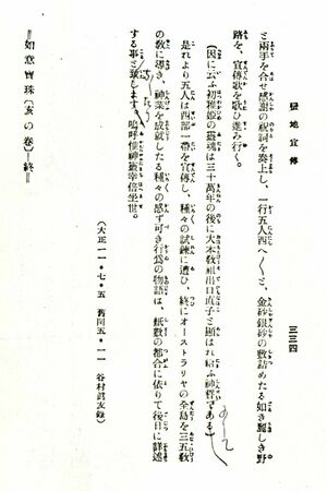 第24巻の初版(大正12年5月10日発行)の最後の章(第16章「慈愛の涙」、382頁)に次の一文がある。〈因に云ふ。初稚姫の霊魂は三十万年の後に大本教祖出口直子と顕はれ、玉能姫の霊魂は天理教祖と顕はれ玉ふ〉。(写真参照)