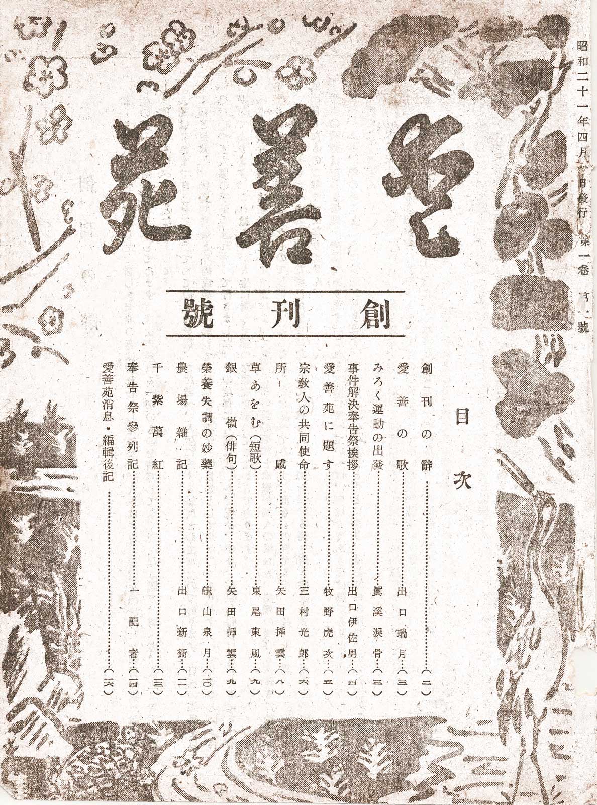 | 2025年3月10日 (月) 00:39 | 愛善苑誌創刊号表紙.jpg (ファイル) | 391キロバイト | IHiroaki | 『愛善苑 (機関誌)』創刊号(昭和21年4月発行)の表紙。 {{デフォルトソート:あいせんえんそうかんこう}} Category:機関紙誌 | 1 | |