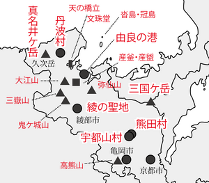 [[ファイル:丹波地方地名地図.png|thumb|霊界物語に登場する丹波地方の主な地名(位置は推定)]] | |||