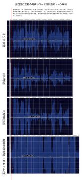 | 2023年11月15日 (水) 19:06 | 肉声レコードのトーン解析.jpg (ファイル) | 621キロバイト | IHiroaki | 出口王仁三郎の肉声レコード復刻版(4社)のトーン解析画像。 採譜支援ソフト「WaveTone」を使い各社版の「たかあまはらにかみつまります」の部分の基本周波数を表示させた。 左側… | 1 | |