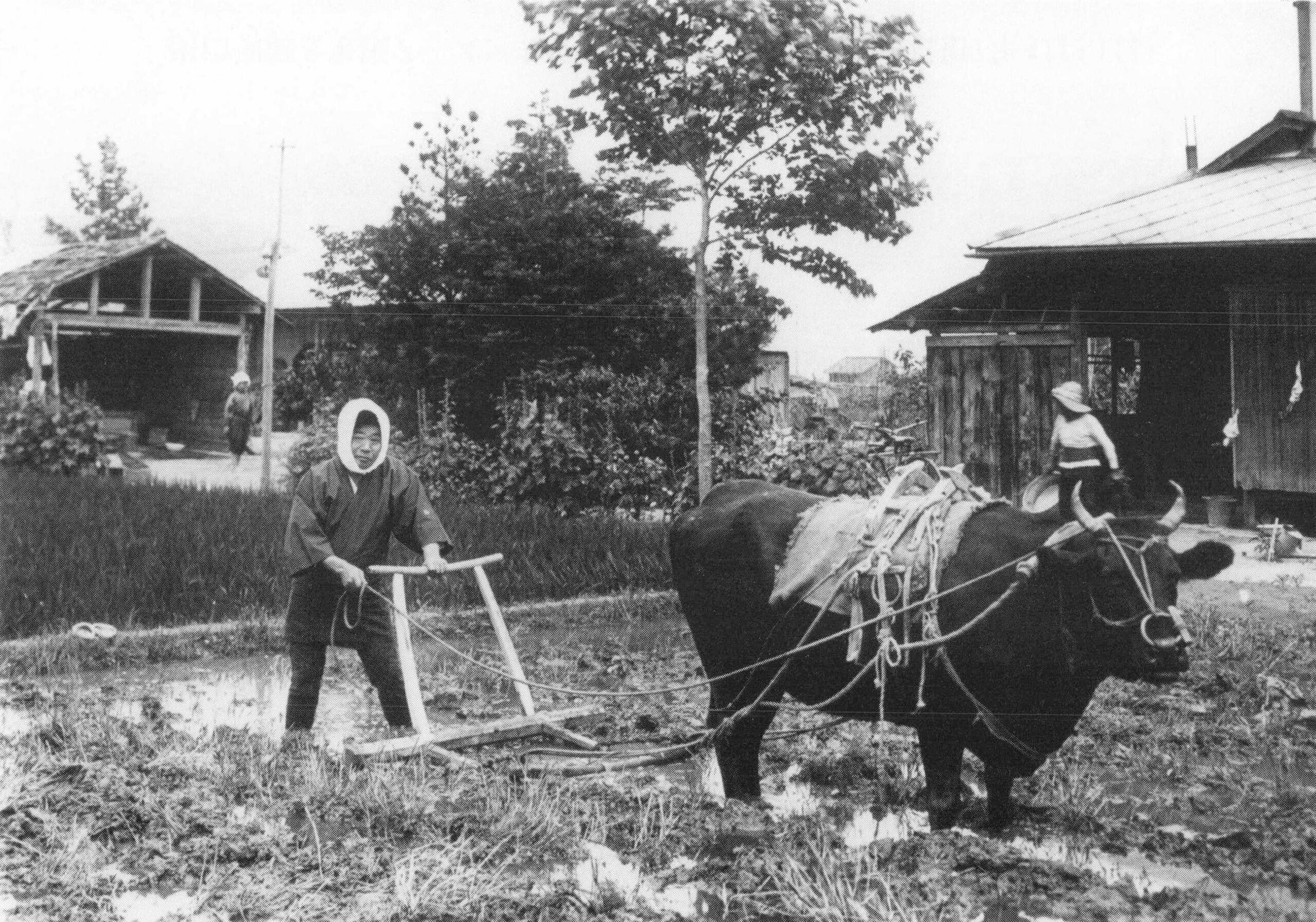 中矢田農園で牛を使い田起こし作業をする出口王仁三郎。昭和6年(1931年)6月10日。
