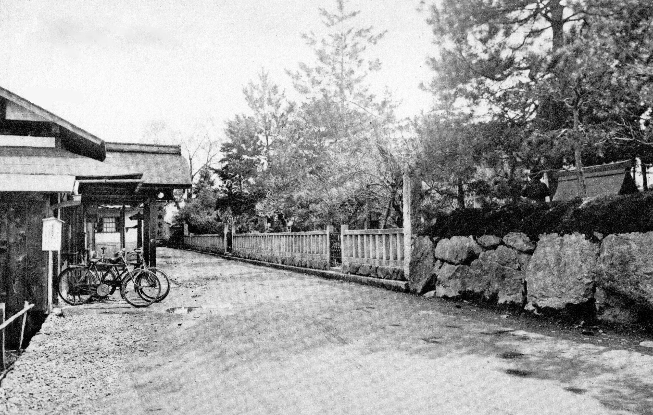 綾部の神苑(現・梅松苑)の受付(左の建物)。撮影時期不明(戦前)。右側のお宮のような屋根は、西石の宮の手前の手水舎か?